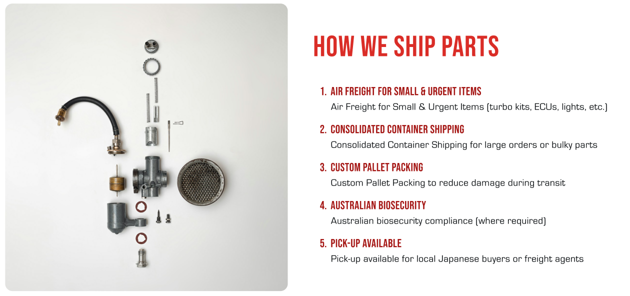 Our stock includes dismantled parts from Japanese auction vehicles, as well as rare and discontinued parts for performance or restoration use. Every item is checked and packed securely for international freight.